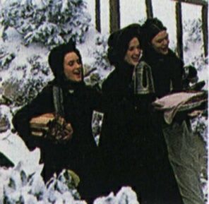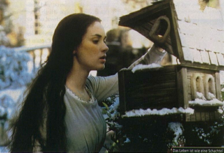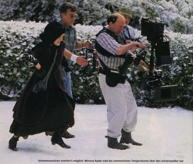 The German text under picture no. 5 reads: "Snow machines make it possible: At midsummer temperatures Winona Ryder rampages over the winterwhite set." (Oh, well. I'm not a translator, but you get the idea...)